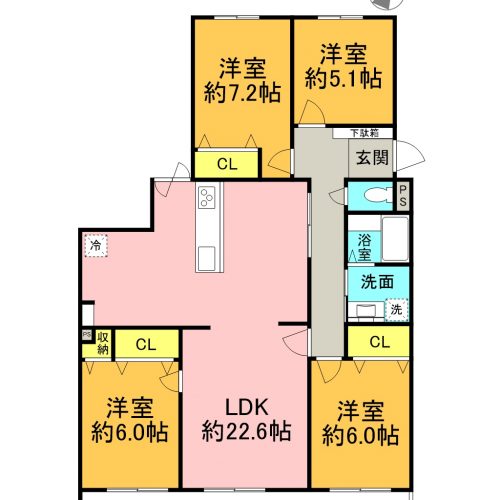 - 専有面積96.28㎡・4LDK。7階建4階部分南向きのため陽当たり良好。キッチンにはパントリー、洗面室にリネン庫、玄関横にはトランクルームがあり収納に優れています。玄関ドア前にアルコープあり。